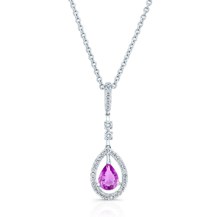 14 Karat White Gold Pendant With 1 Pear Cut Pink Sapphire At 5x7mm And 35 Round Brilliant Diamonds Weighing 0.33 Carats With 17 Inch Cable Chain (hi/si)
