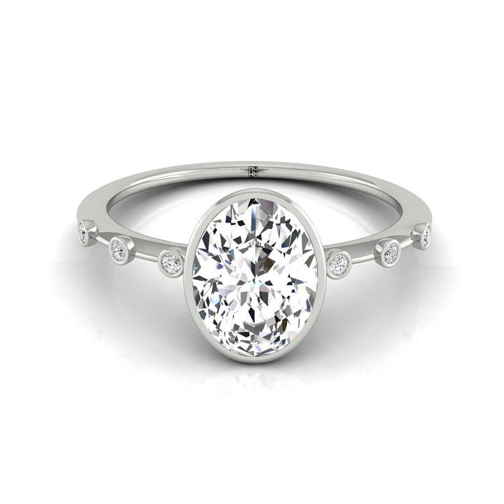 Plat Bezel Set Oval Engagement Ring With 6 Bezel Set Round Diamonds On Shank