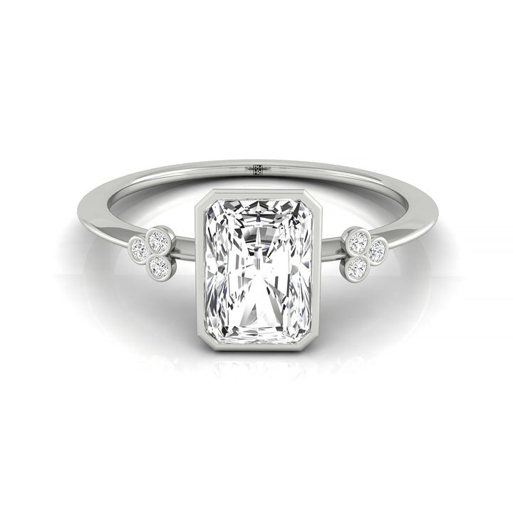 Plat Bezel Set Radiant Engagement Ring With 6 Clover Bezel Set Round Diamonds On Shank