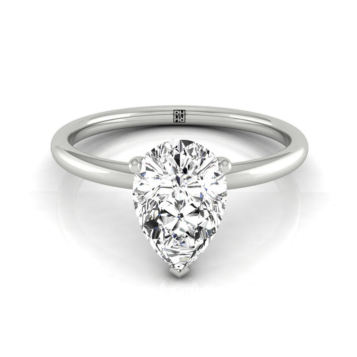 The Exquisite Platinum Pear Engagement Ring Showcases A Captivating Concealed Halo Of 24 Prong Set Round Sparkling Diamonds Encircling The Central Gem, While A Dainty Band Beautifully Complements The Intricate Design For A Stylish And Sophisticated Appearance.