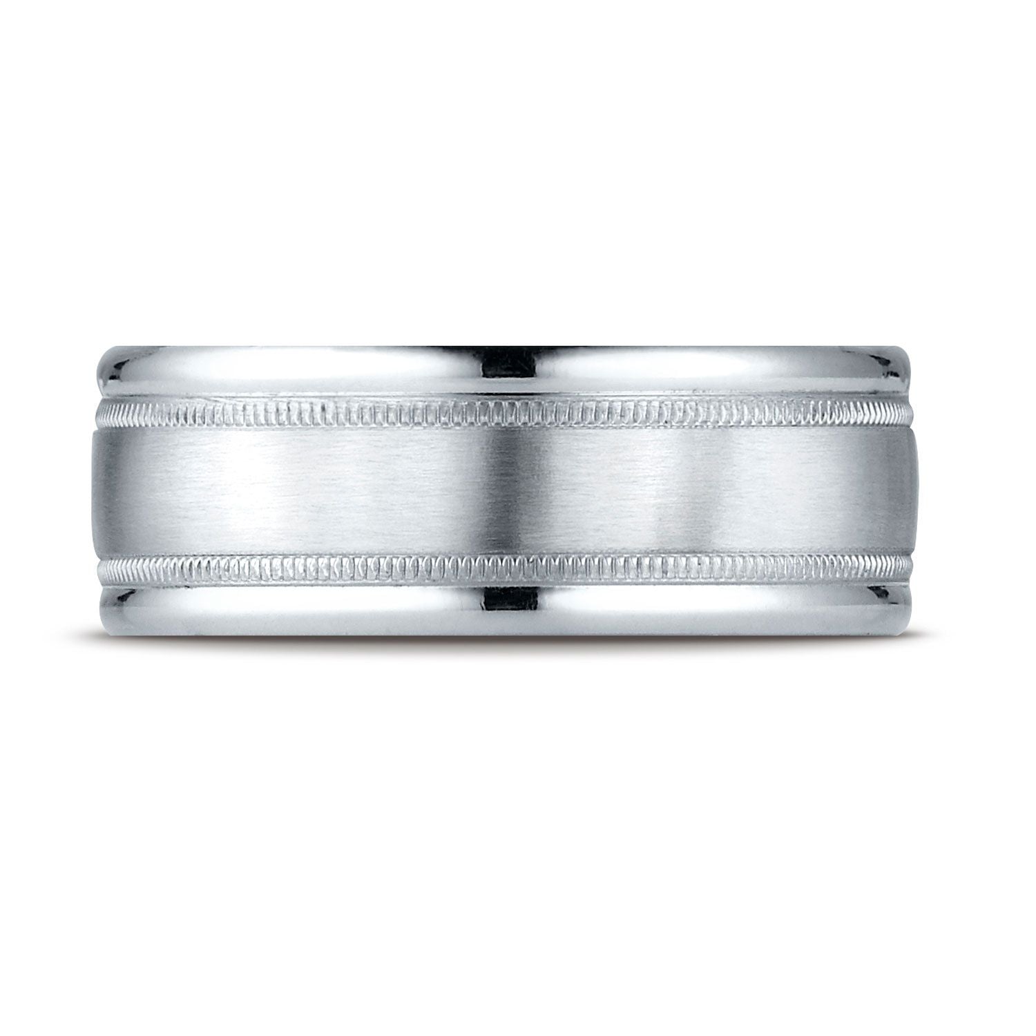 This Beautiful Platinum 8mm Comfort-fit Carved Design Band Features A Satin Finish Center With Milgrain And A Round Edge.