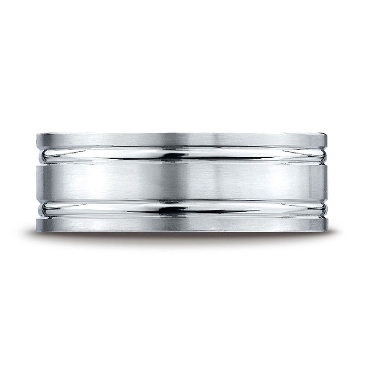 This Incredible Platinum 8mm Comfort-fit Satin-finished Carved Design Band Features Two High Polished Parallel Center Grooves For A Continuous Flow Of Style.