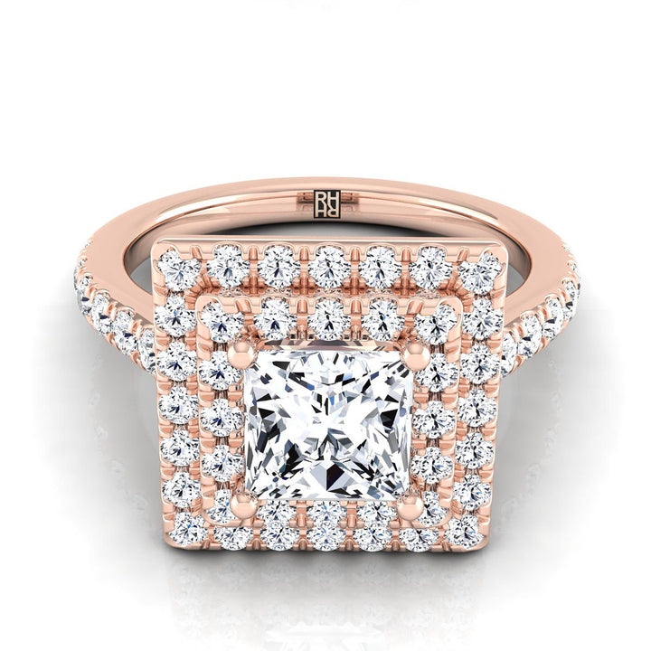 14K Rose Gold Princess Cut Double Pave Halo with Linear Diamond Engagement Ring -7/8ctw