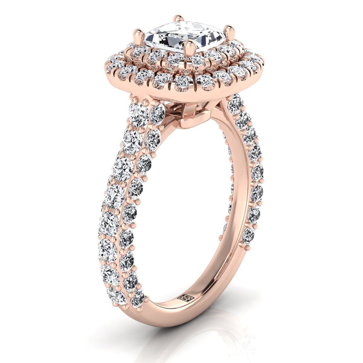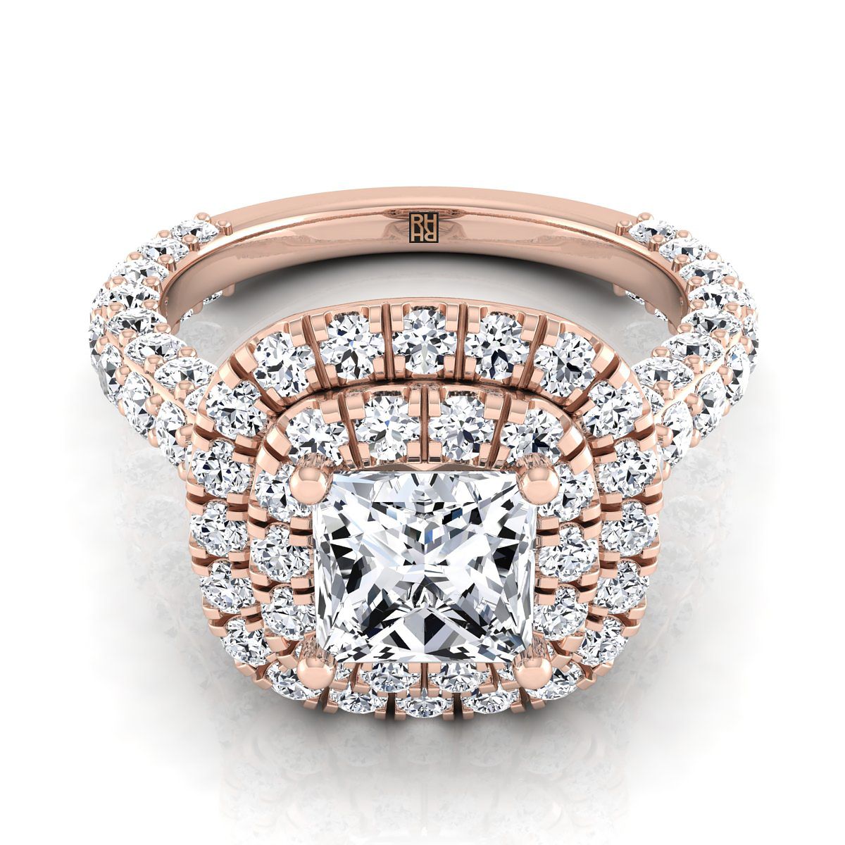An Elegant Statement Of Style, This Princess Cut Double Halo Pave Engagement Ring Showcases Brilliant Cut Diamonds (h-i/vs 2.10ctw) With An Exquisite Pave Shank Mounted In A 14k Rose Gold Setting.