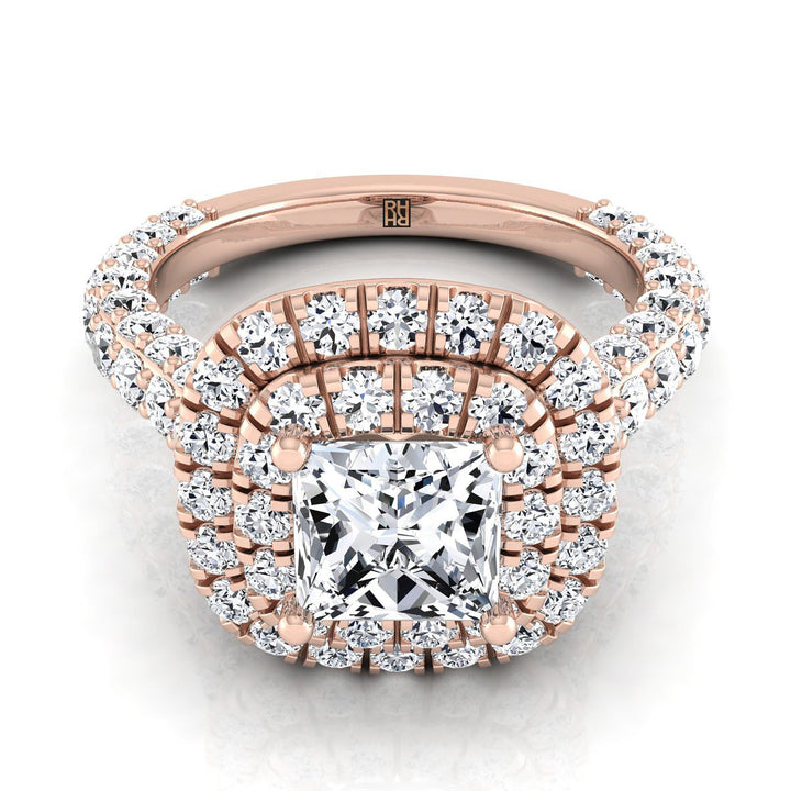 14K Rose Gold Princess Cut Diamond Bold and Fancy Double Halo French Pave Engagement Ring -2ctw