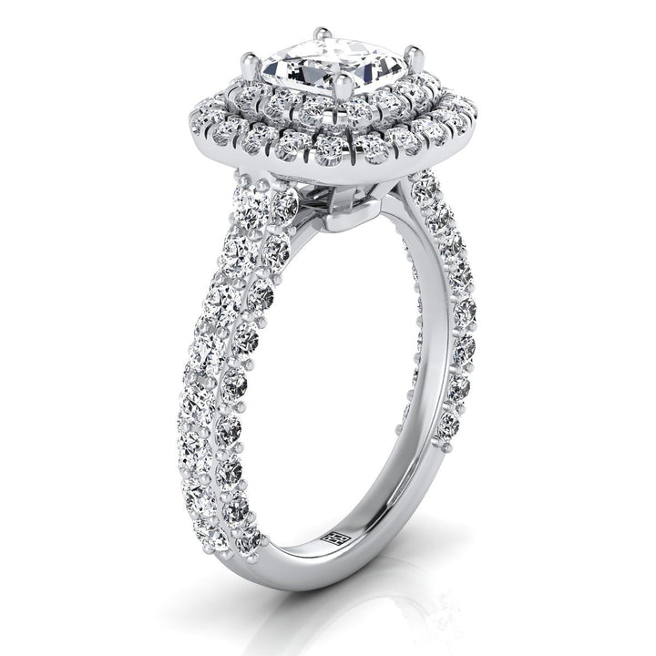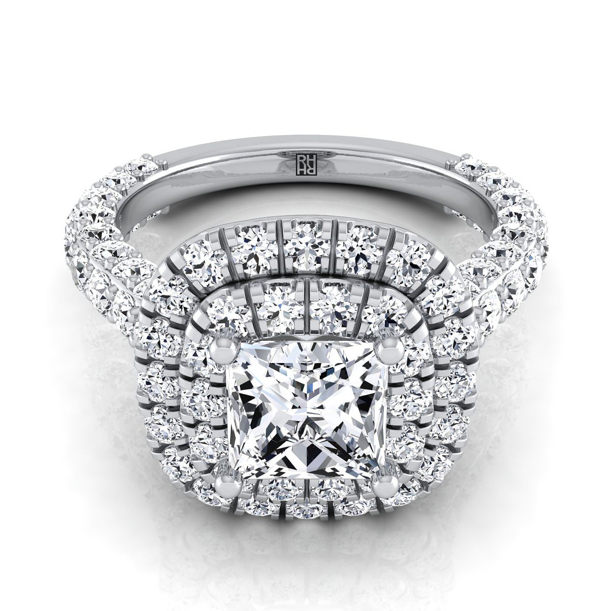 An Elegant Statement Of Style, This Princess Cut Double Halo Pave Engagement Ring Showcases Brilliant Cut Diamonds (h-i/vs 2.10ctw) With An Exquisite Pave Shank Mounted In A 18k White Gold Setting.
