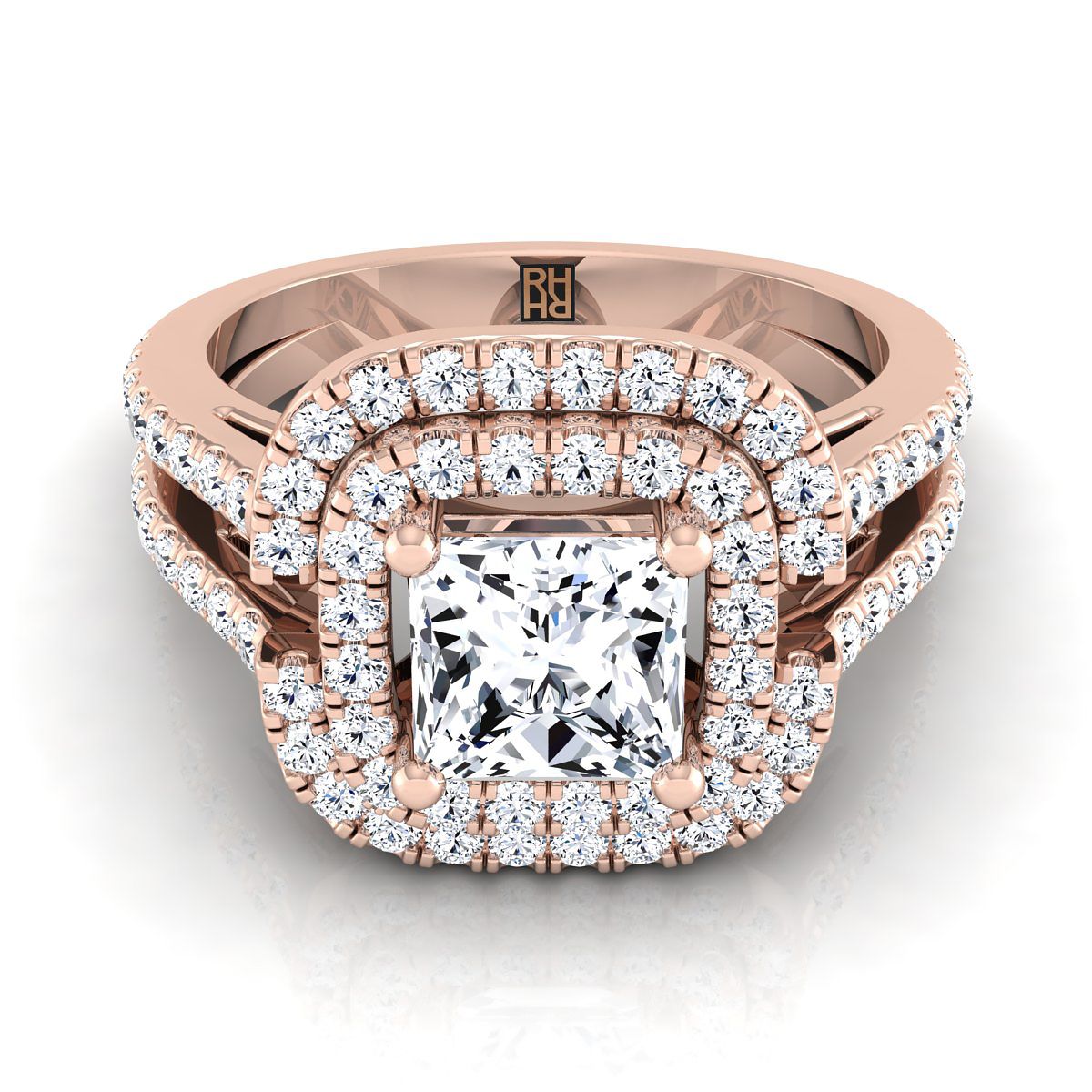 Beautifully Handcrafted, This Princess Cut Double Halo Engagement Ring With Pave Split Shank Showcases Brilliant Cut Diamonds (h-i/vs 0.66ctw) Expertly Set In A Classic 14k Rose Gold Setting.