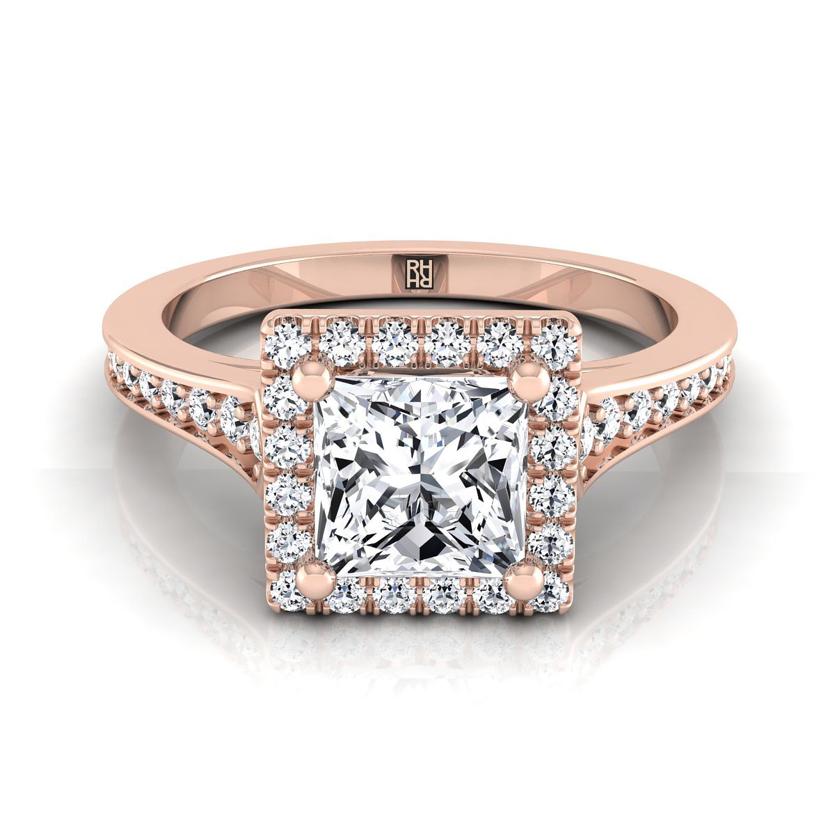 A Modern Statement Of Style, This Princess Cut Diamond Engagement Ring Showcases Brilliant Cut Diamonds (h-i/vs 0.33ctw) Exquisitely Pave Set In A Classic Halo Style, Mounted In 14k Rose Gold.