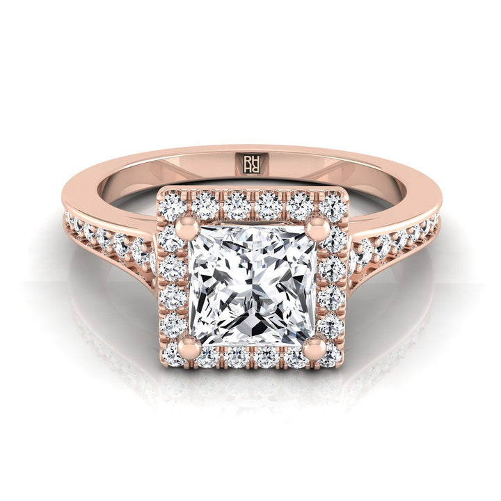 14K Rose Gold Princess Cut Diamond Classic Halo with Channel French Pave Engagement RIng -1/3ctw
