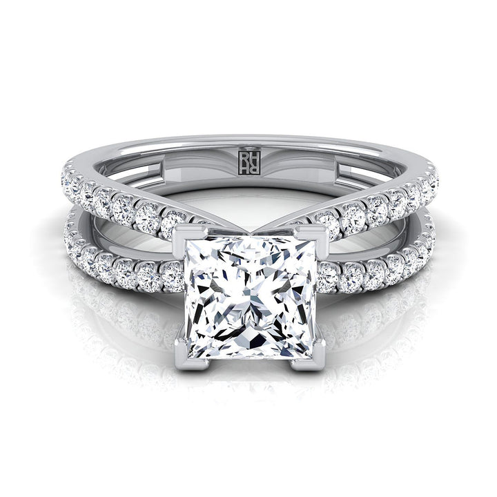 18K White Gold Princess Cut Diamond Two Row Pavé Split Shank Engagement Ring -1/3ctw