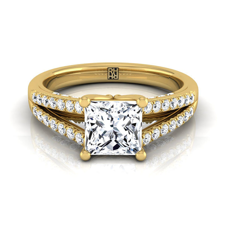 18K Yellow Gold Princess Cut Diamond Split Shank French Pave Engagement Ring -1/3ctw