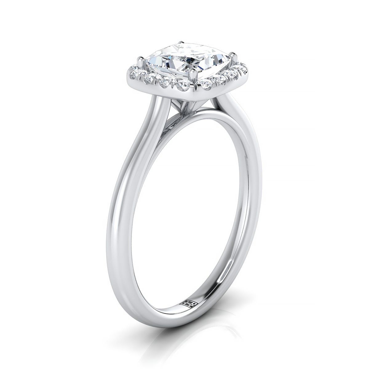 An Elegant Statement Of Style, This Princess Cut Halo Engagement Ring With High Polished Shank Showcases Brilliant Cut Diamonds (h-i/vs 0.20ctw) Beautifully Set In A Classic Platinum Setting.