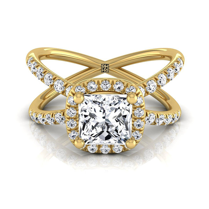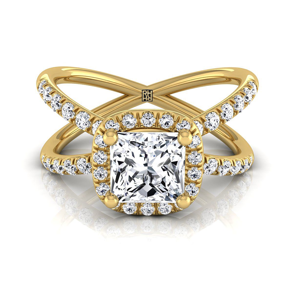 18K Yellow Gold Princess Cut Diamond Open Criss Cross French Pave Engagement Ring -1/2ctw