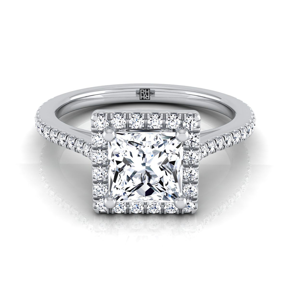 14K White Gold Princess Cut Classic French Pave Halo and Linear Engagement Ring -1/4ctw