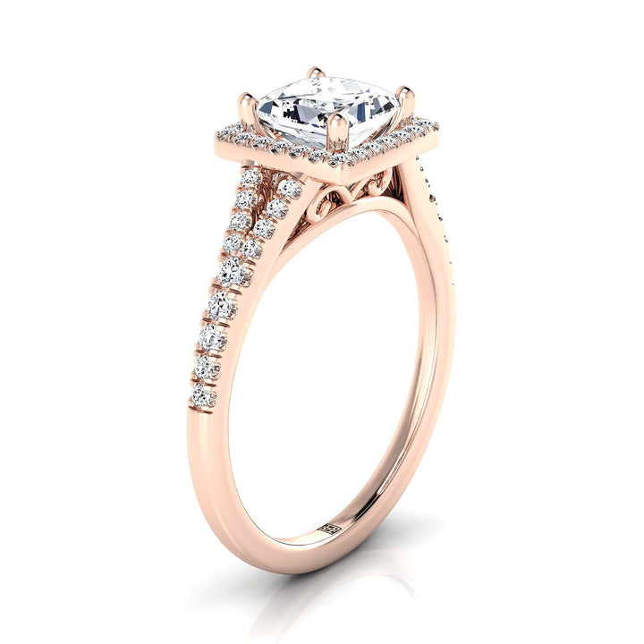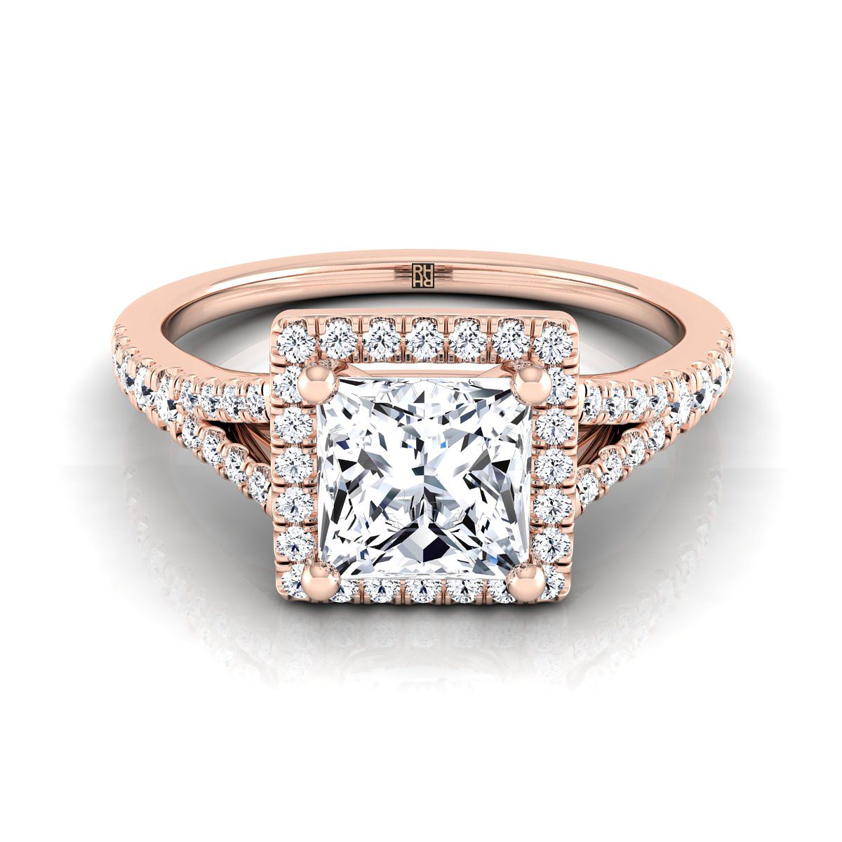 14K Rose Gold Princess Cut French Pave Split Shank Halo Engagement Ring -1/4ctw