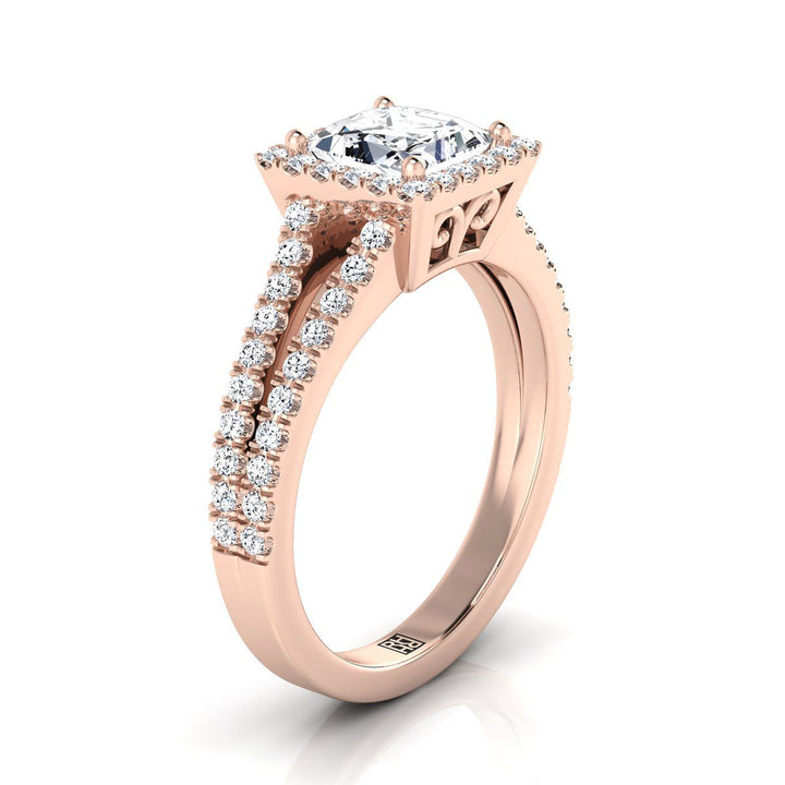 14K Rose Gold Princess Cut Diamond Halo Center with French Pave Split Shank Engagement Ring -3/8ctw