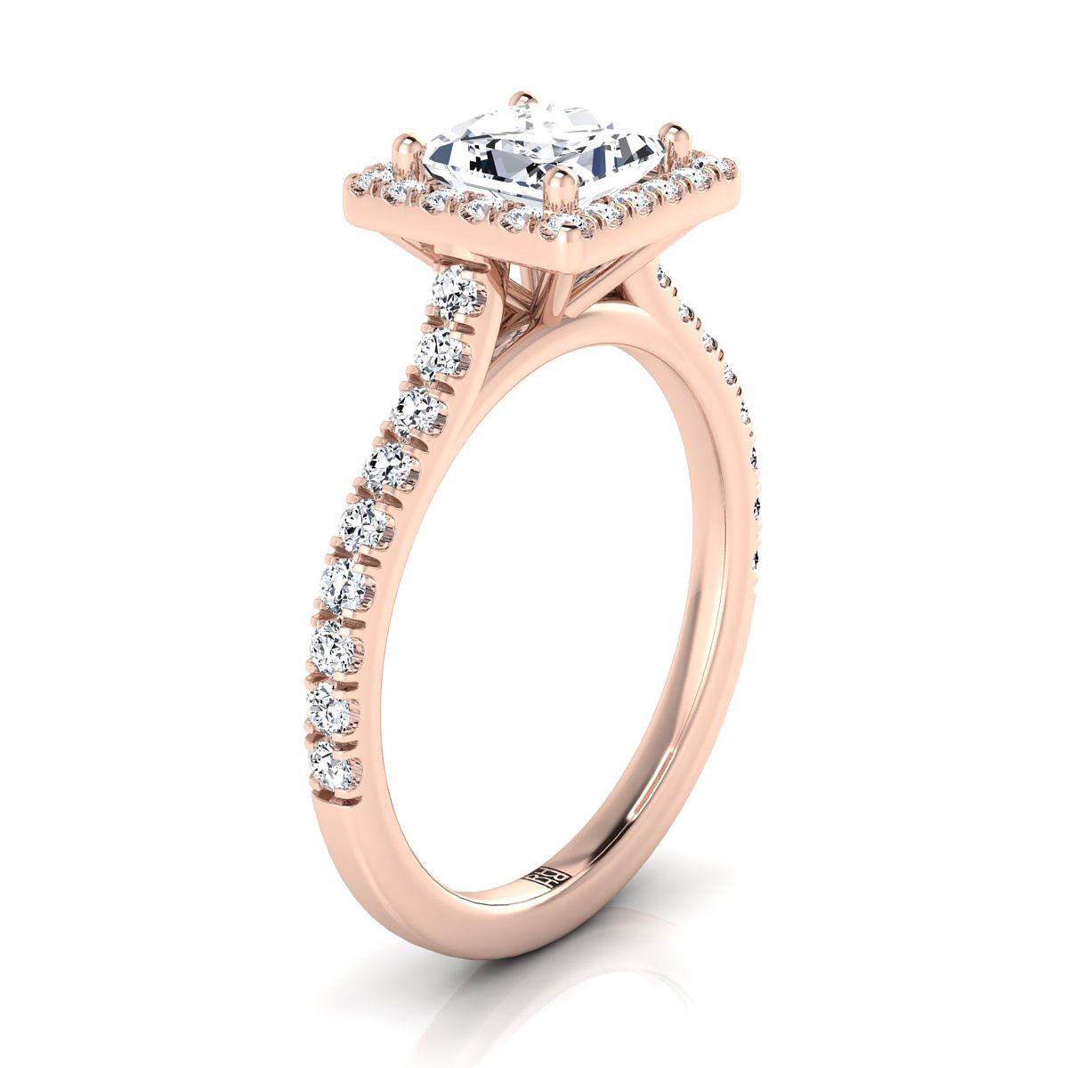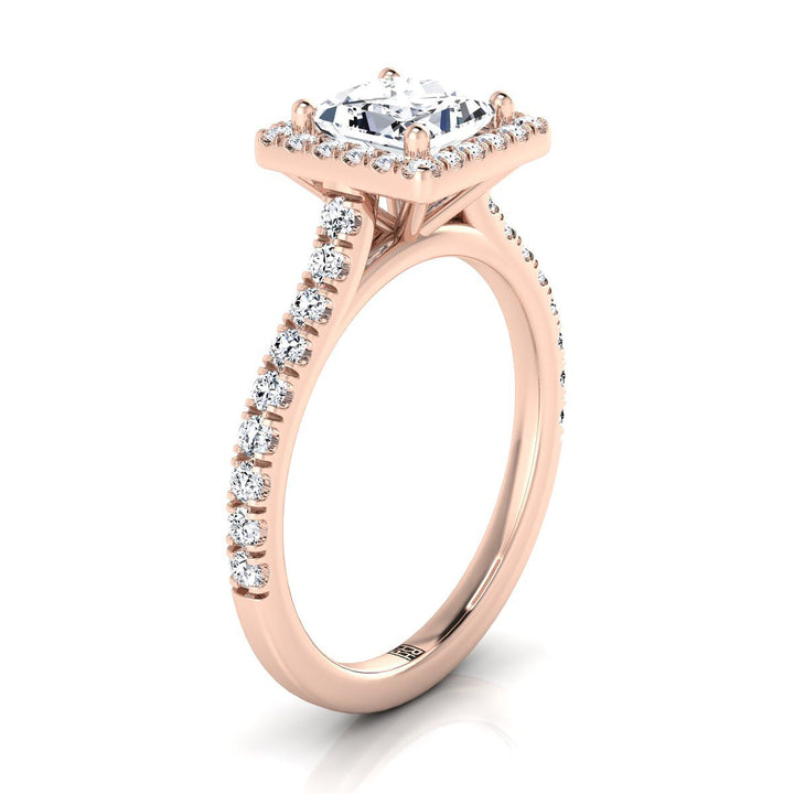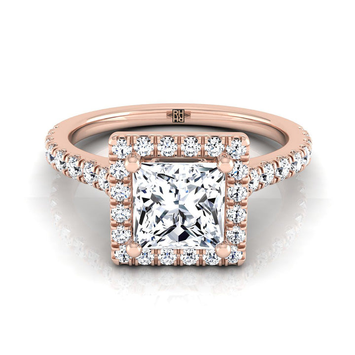 14K Rose Gold Princess Cut Diamond Shared Prong Halo with French Pave Engagement Ring -3/8ctw