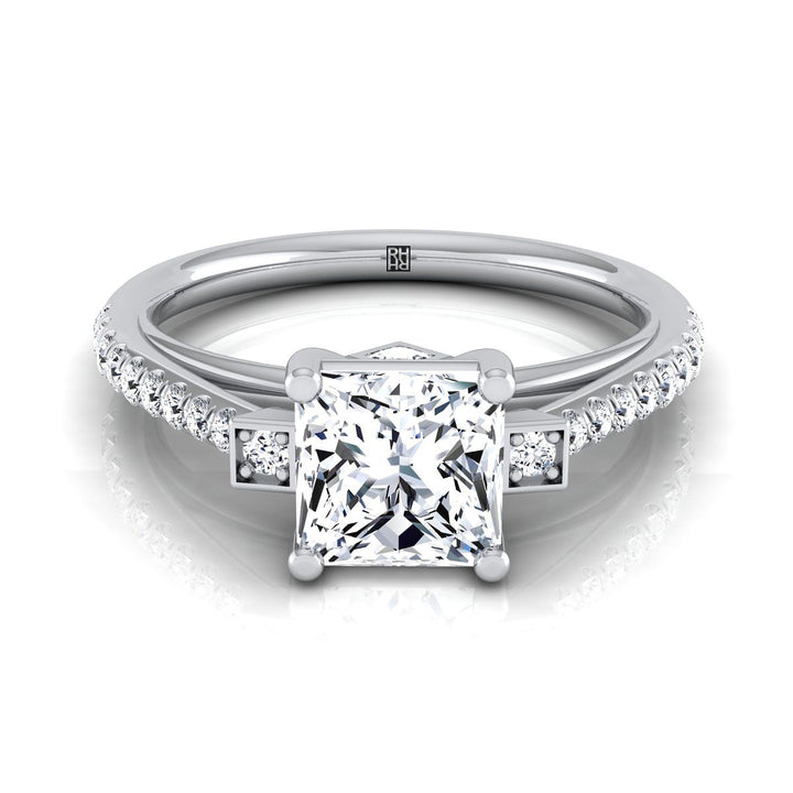 14K White Gold Princess Cut Diamond Delicate Three Stone Pave Engagement Ring -1/3ctw