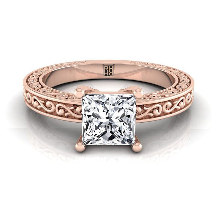 14K Rose Gold Princess Cut Hand Engraved Scroll Vintage Solitaire Engagement Ring