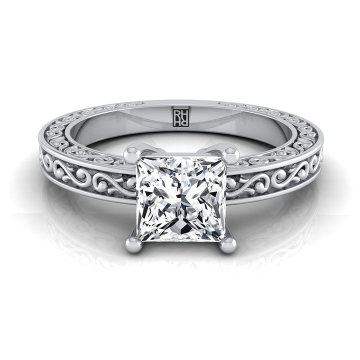 14K White Gold Princess Cut Hand Engraved Scroll Vintage Solitaire Engagement Ring