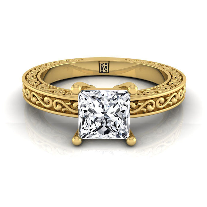 18K Yellow Gold Princess Cut Hand Engraved Scroll Vintage Solitaire Engagement Ring