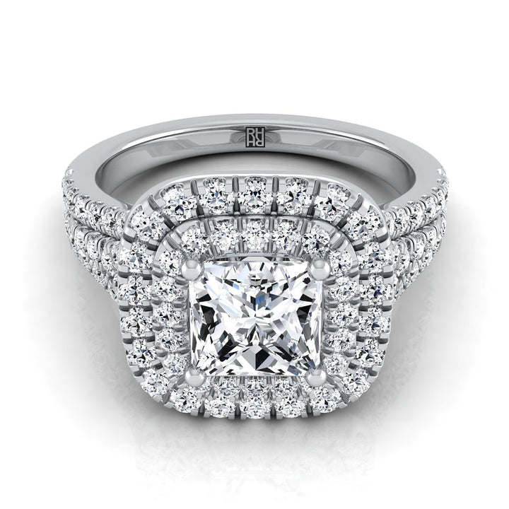 14K White Gold Princess Cut Diamond Four Row Split Shank Pave Double Halo Diamond Engagement Ring -7/8ctw