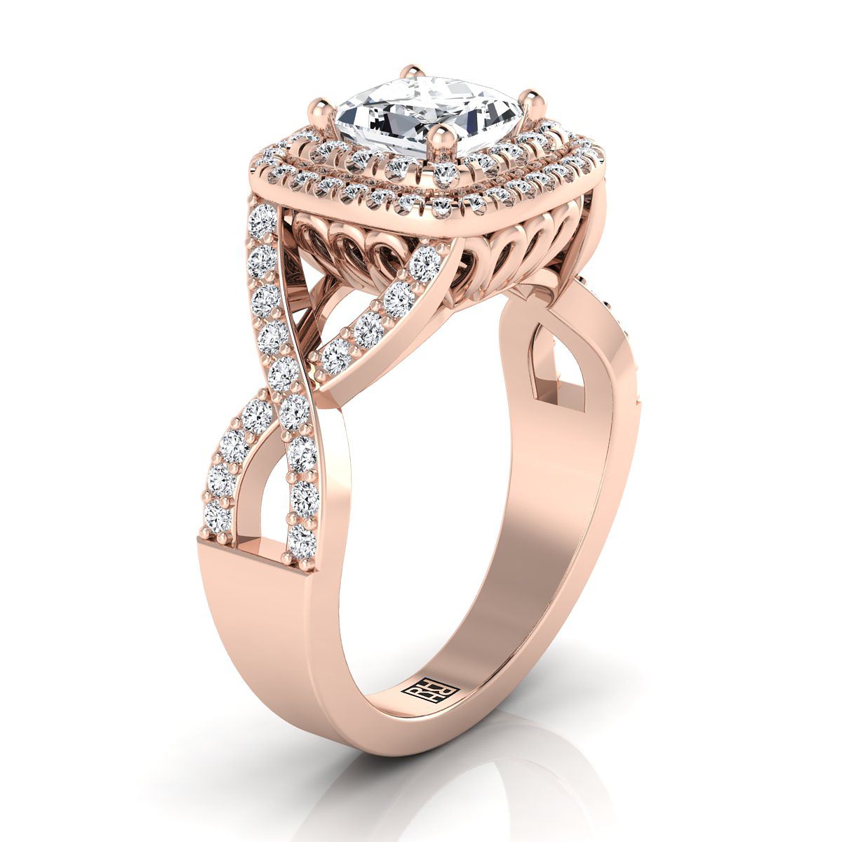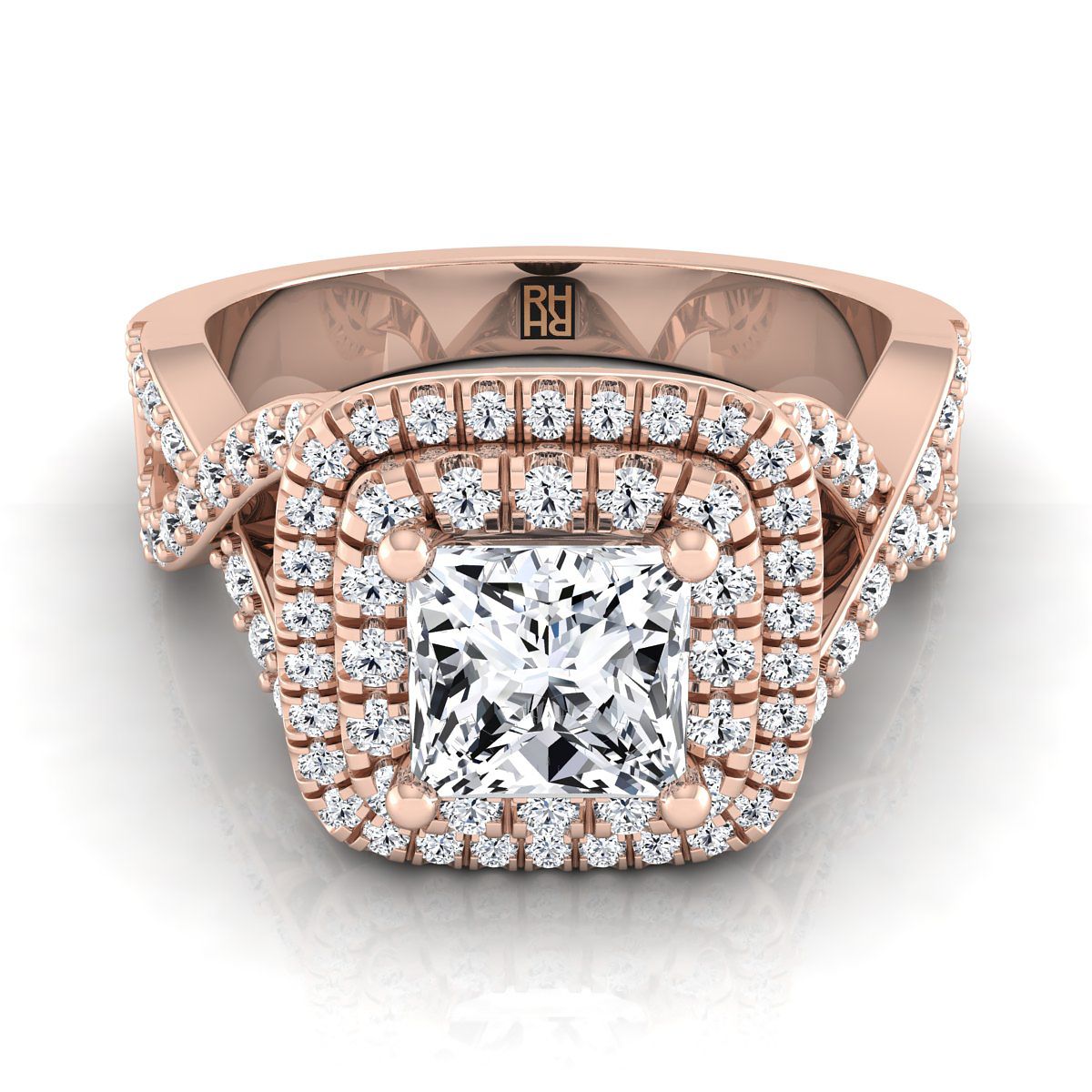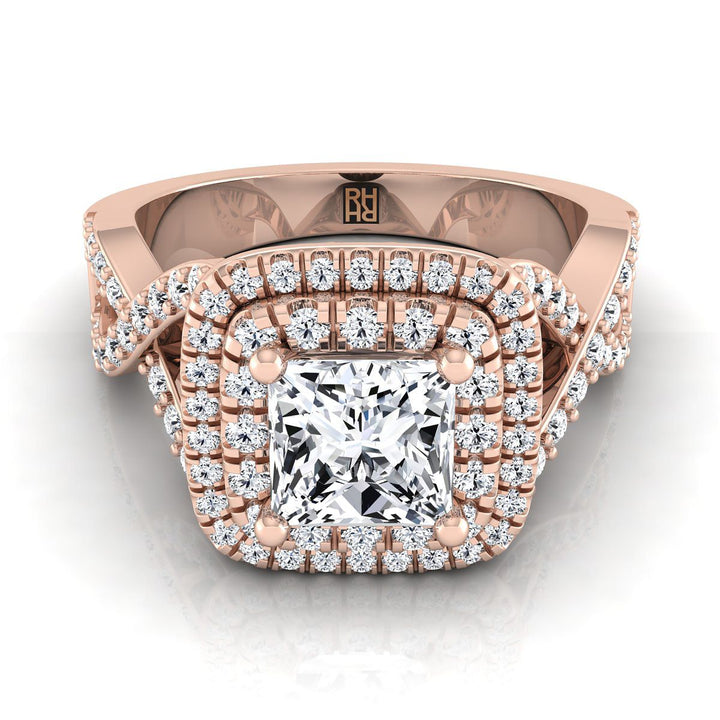 14K Rose Gold Princess Cut Diamond Twist French Pave Double Halo Diamond Engagement Ring -1/2ctw