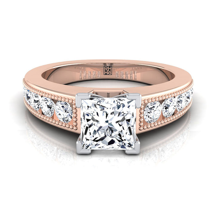 14K Rose Gold Princess Cut Diamond Antique Milgrain Bead and Channel Set Engagement Ring -1/2ctw