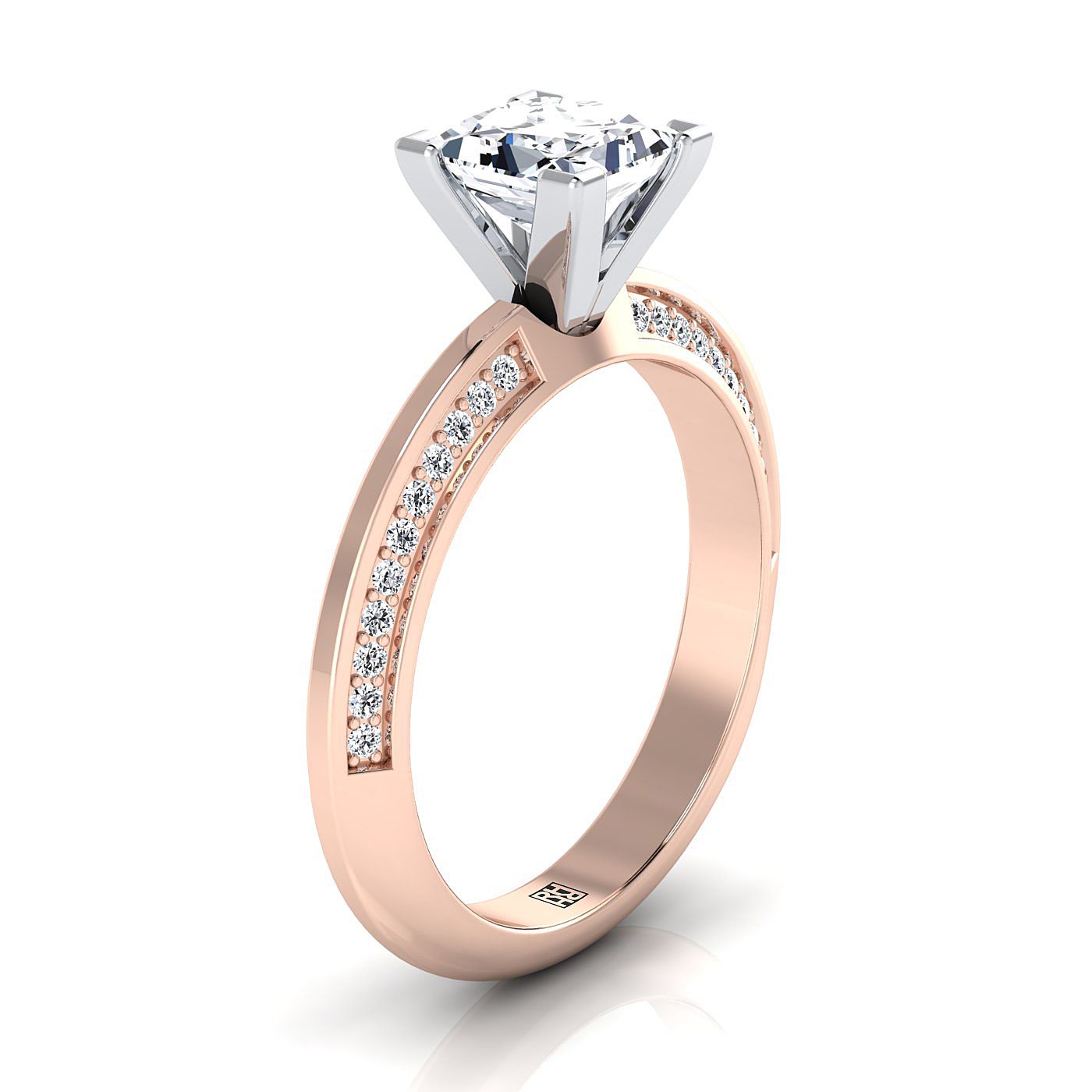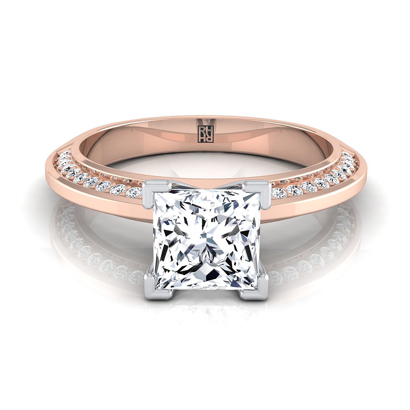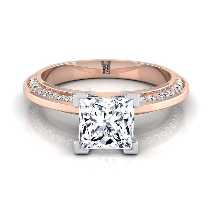 Classic Princess Cut Center Diamond Engagement Ring With A Knife Edged Pave Gallery Showcasing Brilliant Cut Diamonds (h-i/vs 0.20ctw) Beautifully Set In An Elegant 14k Rose Gold Setting.