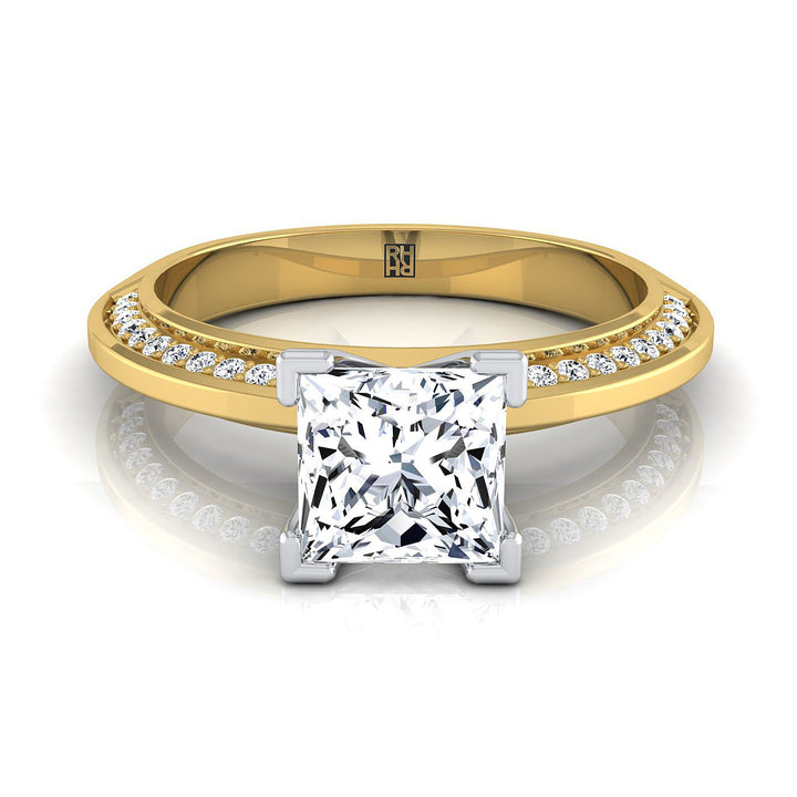 Classic Princess Cut Center Diamond Engagement Ring With A Knife Edged Pave Gallery Showcasing Brilliant Cut Diamonds (h-i/vs 0.20ctw) Beautifully Set In An Elegant 14k Yellow Gold Setting.
