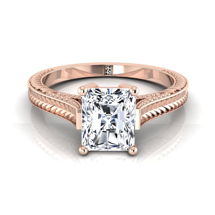 Understated Elegance, This Radiant Cut Diamond Engagement Ring Showcases An Antique Inspired Engraved Design With A Classic Millgrain Finish In 14k Rose Gold