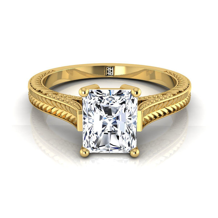 Understated Elegance, This Radiant Cut Diamond Engagement Ring Showcases An Antique Inspired Engraved Design With A Classic Millgrain Finish In 14k Yellow Gold