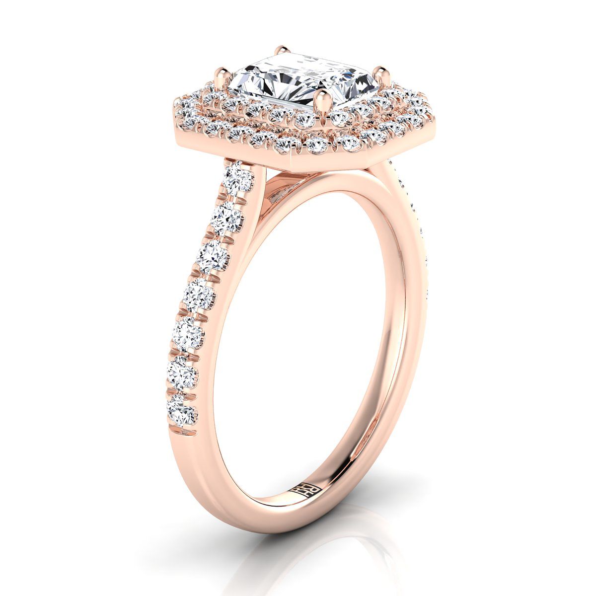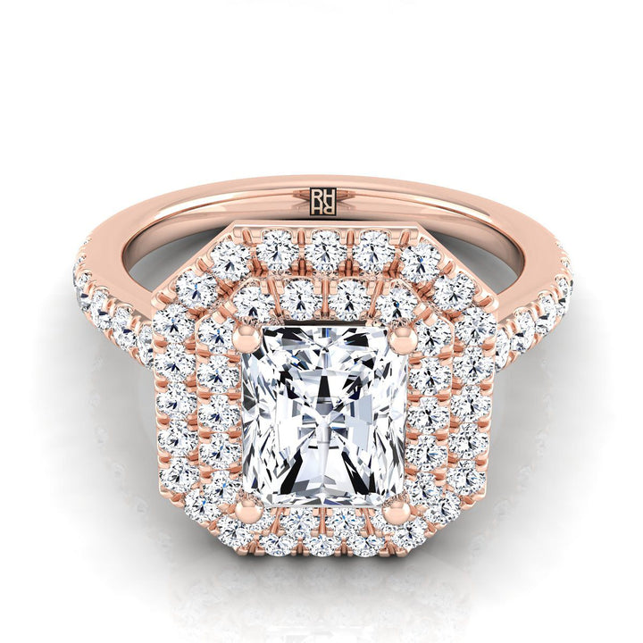 14K Rose Gold Radiant Cut Center Double Pave Halo with Linear Diamond Engagement Ring -7/8ctw