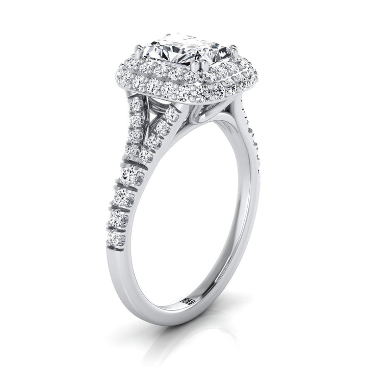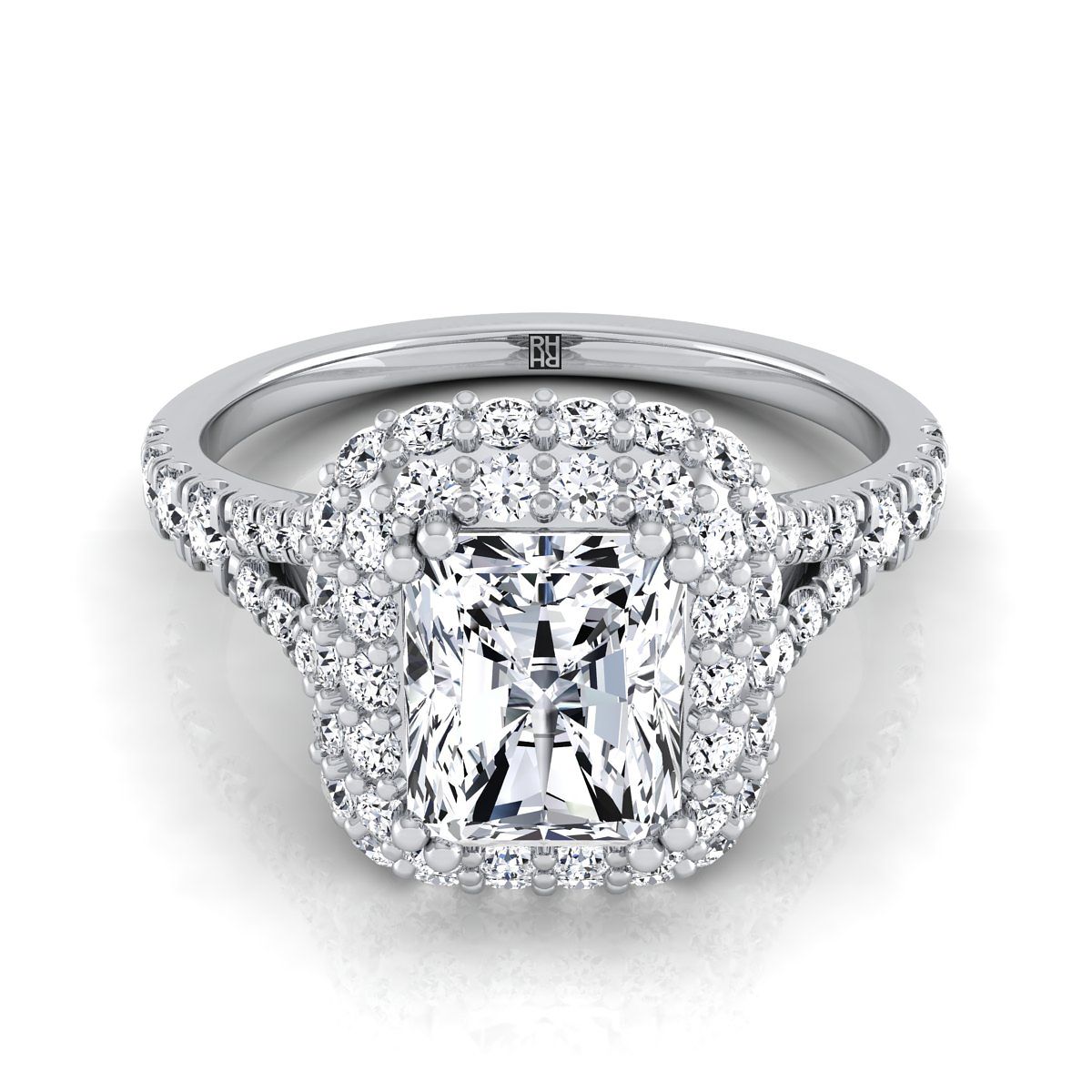 14K White Gold Radiant Cut Center Diamond Double Halo Split Shank French Pave Engagement Ring -5/8ctw