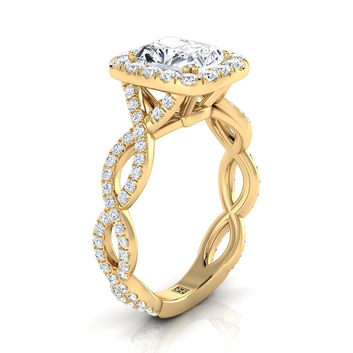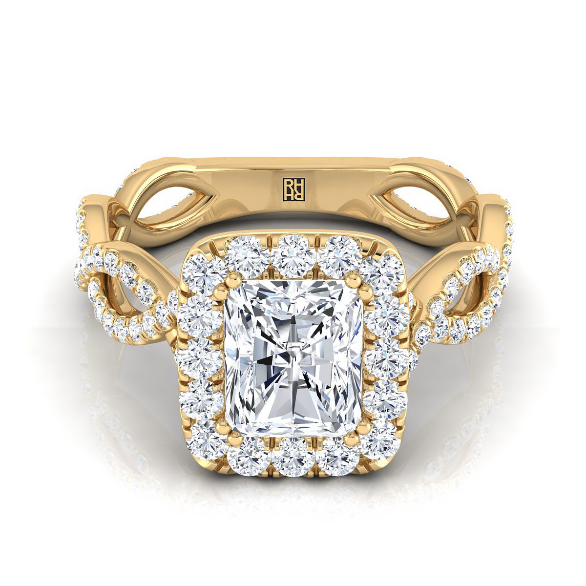 Classic With A Bold Twist, This Radiant Cut Halo Engagement Ring With Pave Ribbon Design Shank Showcases Brilliant Cut Diamonds (h-i/vs 0.80ctw) Beautifully Set In A Classic 14k Yellow Gold Setting.