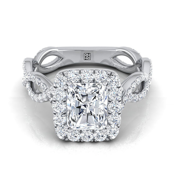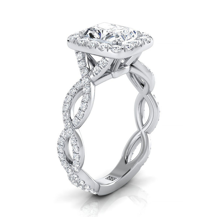 18K White Gold Radiant Cut Center Diamond Ribbon Twist French Pave Halo Engagement Ring -3/4ctw