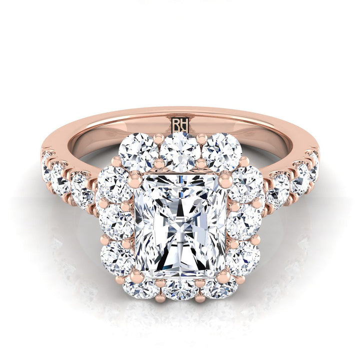 14K Rose Gold Radiant Cut Center Diamond Luxe Style French Pave Halo Engagement Ring -1-1/10ctw