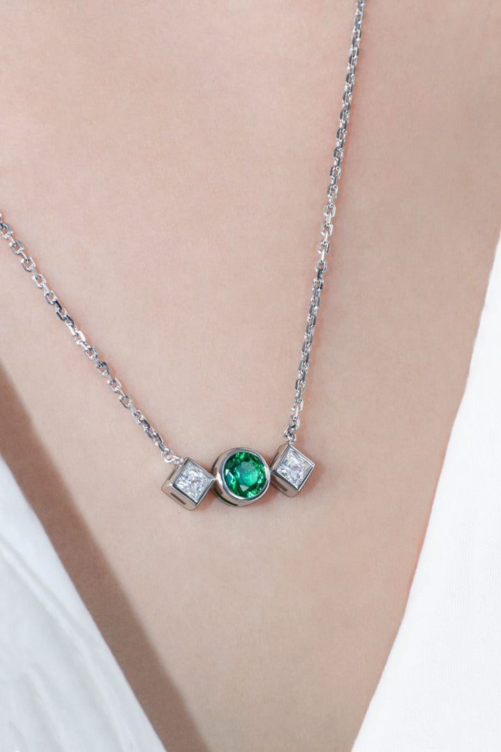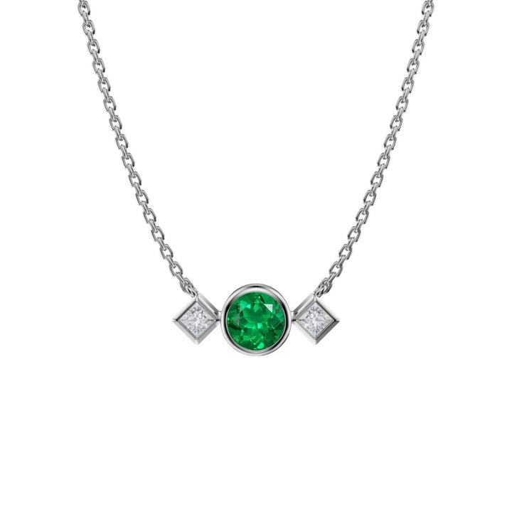 ROCKHER .925 Sterling Silver Round Created Emerald and Princess Cut White Cubic Zirconia Bezel Set Pendant Necklace on 18" Chain