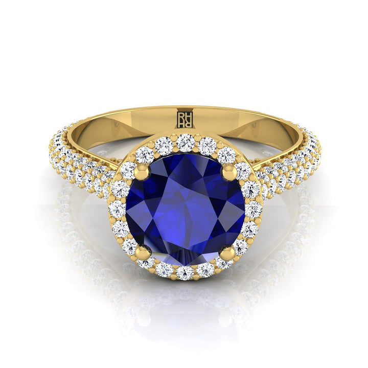 18K Yellow Gold Round Brilliant Sapphire Micro-Pavé Halo With Pave Side Diamond Engagement Ring -7/8ctw