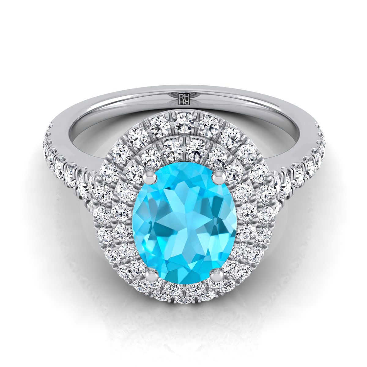18K White Gold Oval Swiss Blue Topaz Double Halo with Scalloped Pavé Diamond Engagement Ring -1/2ctw